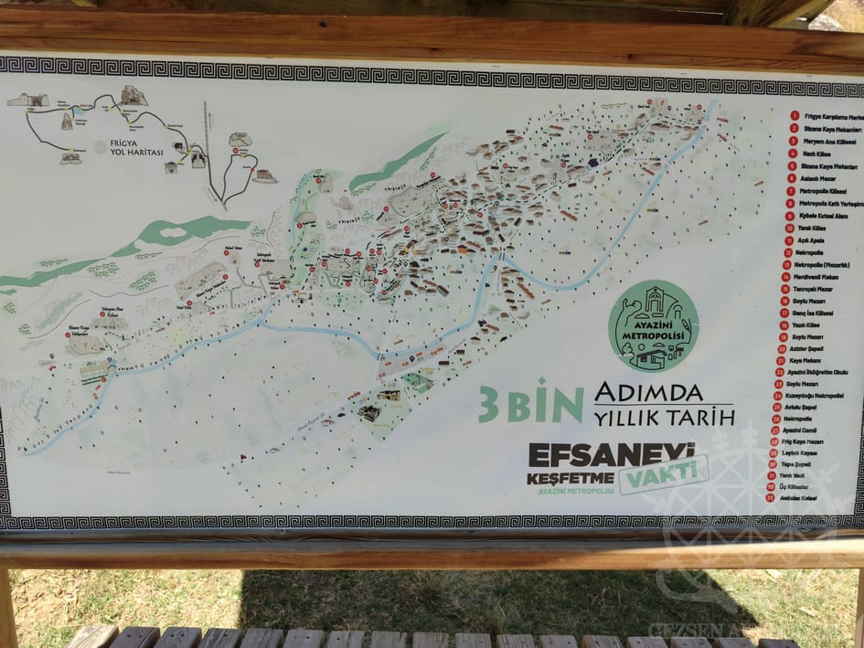 AYAZİNİ KAYA MEZARLARI: Ayazini Kasabası’nın Frigler’in ilk dönemlerinden bu yana yerleşim yeri olarak kullanıldığı bilinmektedir. Roma ve Bizans dönemlerine ait, aile ve tek kişilik kaya mezar odaları biçiminde olup, bazıları çift katlı olarak oyulmuşlardır. Ayazini Beldesi’nin mezarlığının da aynı yerde olması, mezar yeri seçimi bakımından insanların aynı yeri kullanması açısından önemli bir bilgi vermektedir. Mezar odalarının cephelerinde içinde Medusa başları bulunan üçgen alınlıklı sütunlu ön boşluklu, kapı ile girilen oda içinde kemerli tekne mezarlar vardır. Bazıları aslan kabartmalarıyla süslendiği gibi, birinde de mezar sahibi karı ve kocanın kabartmaları yapılmıştır.